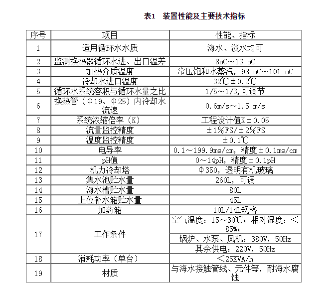 主要功能:装置具备2套循环系统,能同时进行两种水处理方案或两种工艺条件的试验。系统配有先进的检测设备和完善的自动控制系统,整体技术处于国内领先水平。主要设备包括模拟换热器、海水冷却塔、自动加药系统、自动排污系统、腐蚀在线监测、污垢热阻监测等,并根据化工冷却系统特点,设计了一套自动化监控管理系统,可实现自动加药、温度、流量自动控制,温度、流量、压力、电导率、浓缩倍数、pH、补水量、加药量、腐蚀速率、污垢热阻等参数的自动监测和试验数据的自动记录、处理等诸多功能。