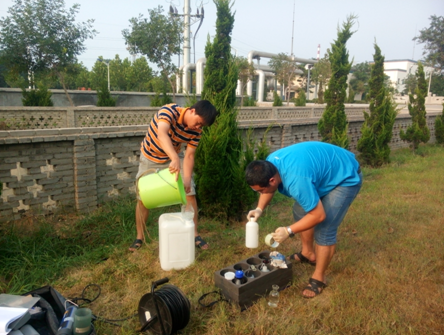 一路上遭遇了数次因事故导致的堵车,赶到东海电厂时已经下午5点了,大家顾不上休息,立刻开始了采样工作,由于电厂在排水渠两侧修了1米左右的围墙,需探出身去采样,取水桶不免会碰到墙壁,为避免水样混入泥沙影响悬浮物的测定,取样桶一旦碰到墙壁取样人员就只能将好不容易拉上来的水样倒掉重新取,这样往往取三四次才能满意一次。取好样品,分类加入保存药剂,并放入冷藏箱中保存。厂方陪同人员被U钱包APP SERVER技术人员认真负责的态度所感动,他们说真没想到以为简单的水质采样竟然这么麻烦,不愧是专业队伍。